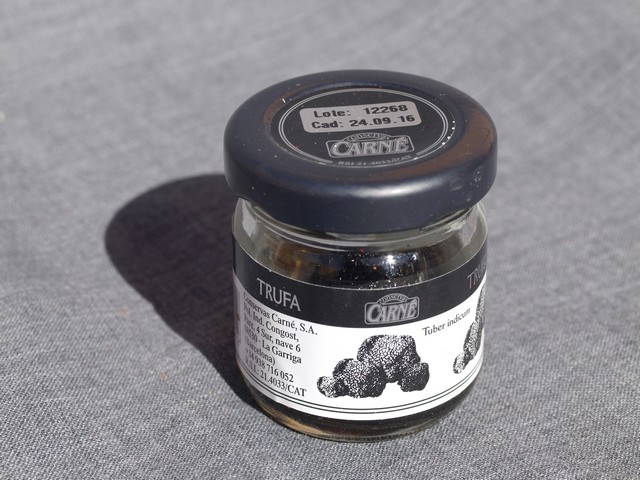Trüffel im Glas der Marke Carné. Sie werden in ihrem eigenen Saft angeboten und besitzen ein Abtropfgewicht von 10 g. Es handelt sich um die Sorte Tuber Indicum.